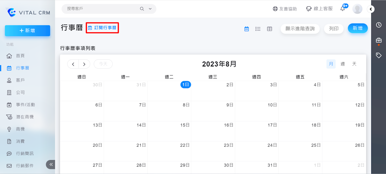 1. 請您先至【行事曆>訂閱行事曆】取得 Vital CRM 訂閱行事曆連結。