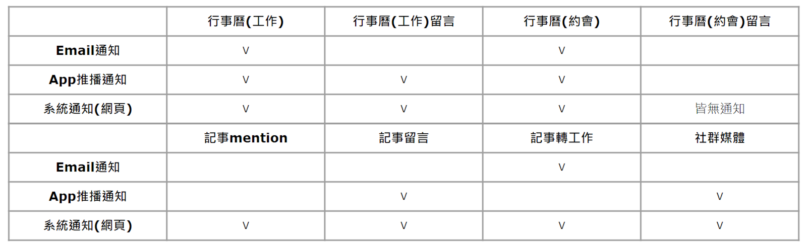 系統在行事曆指派、留言、約會指派、留言,記事相關留言、轉工作,社群媒體等,相關通知機制如下: