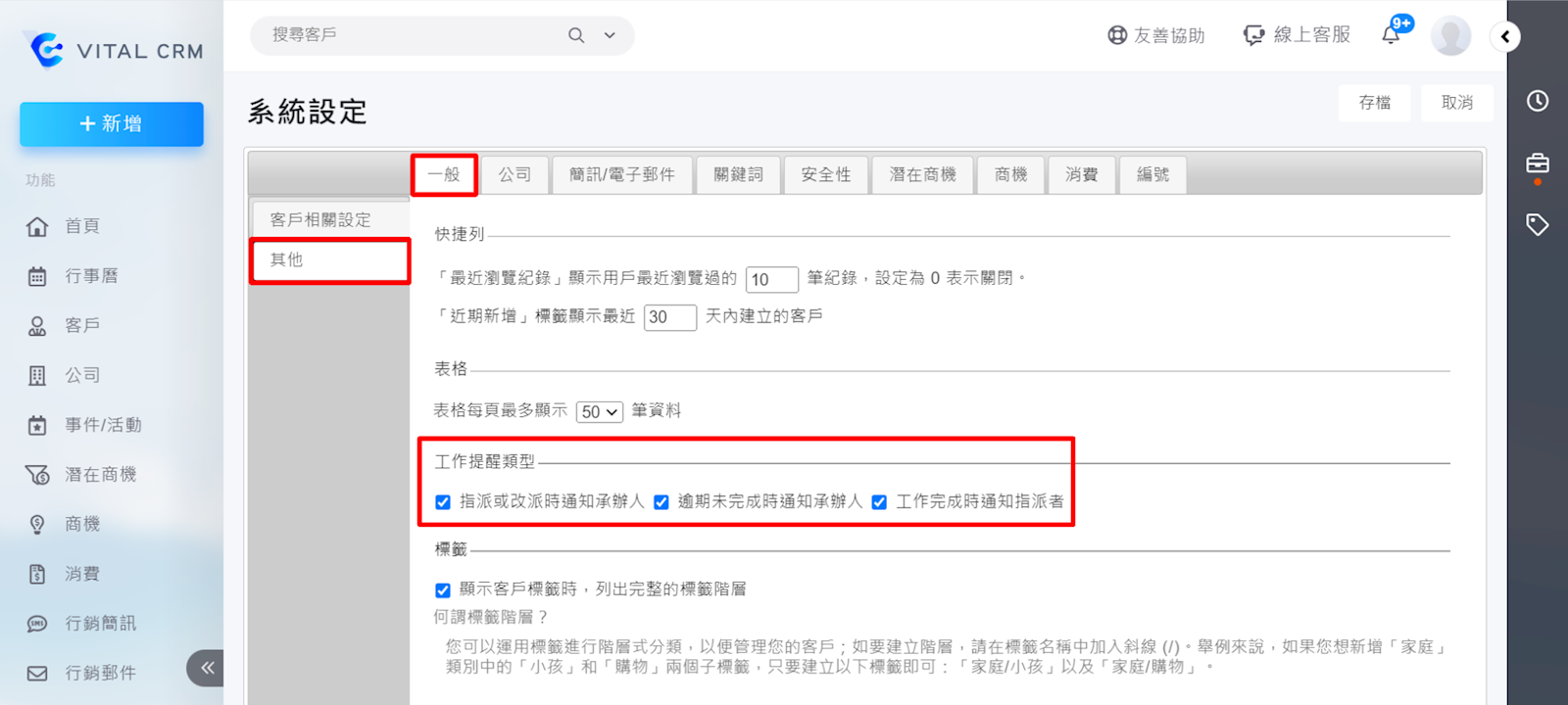 如欲設定工作提醒類型,可請系統管理者至首頁左下方【管理>系統設定>一般>其他】中,在「工作提醒類型」中勾選(或取消勾選)提醒項目。