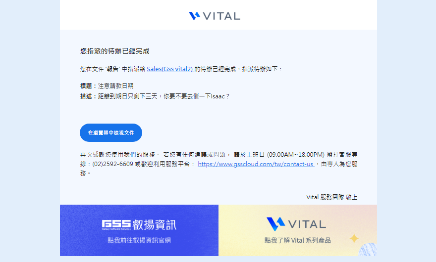 當交辦負責人完成工作時,系統會寄送 Email 立即通知指派人。