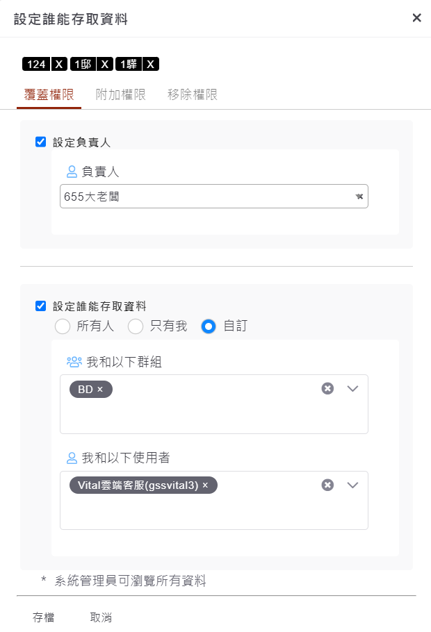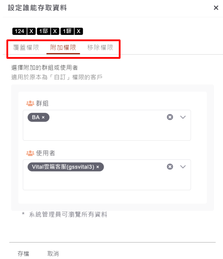 - 【附加權限】與【移除權限】,僅針對原本權限為【自訂】的資料,其他權限的資料則不會受到影響。