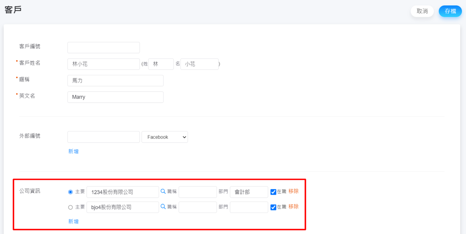 舉以下的例子來說,此客戶身上有兩間公司: 1234股份有限公司 & bjo4股份有限公司,而1234股份有限公司被設為主要公司。