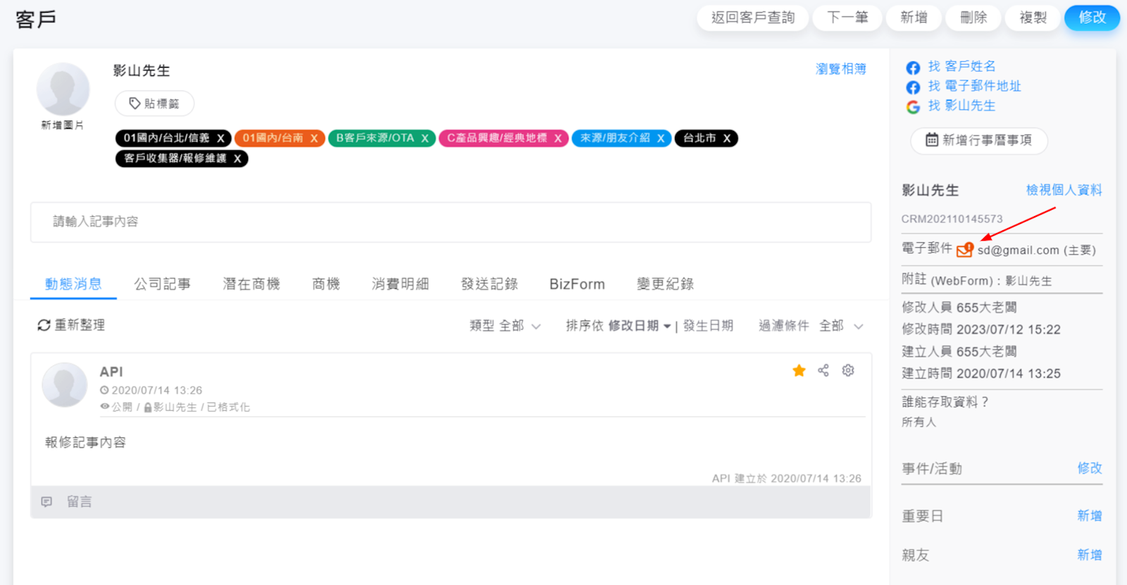 在客戶資料頁面,電子郵件前方若有出現驚嘆號符號,表示該信箱存在於【問題信箱】中,可以至【管理>資料>問題信箱】中查看問題信箱。