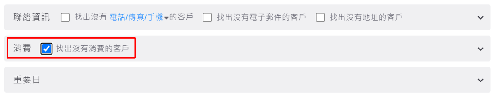 1.點選列表左上方【客戶>更多條件>找出沒有消費的客戶】。