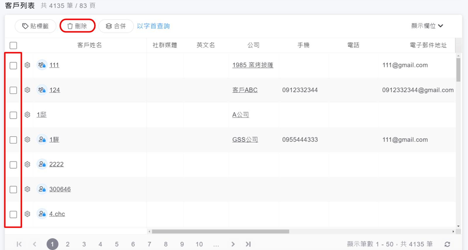2. 找出客戶後,即可勾選客戶並點選上方【刪除】。