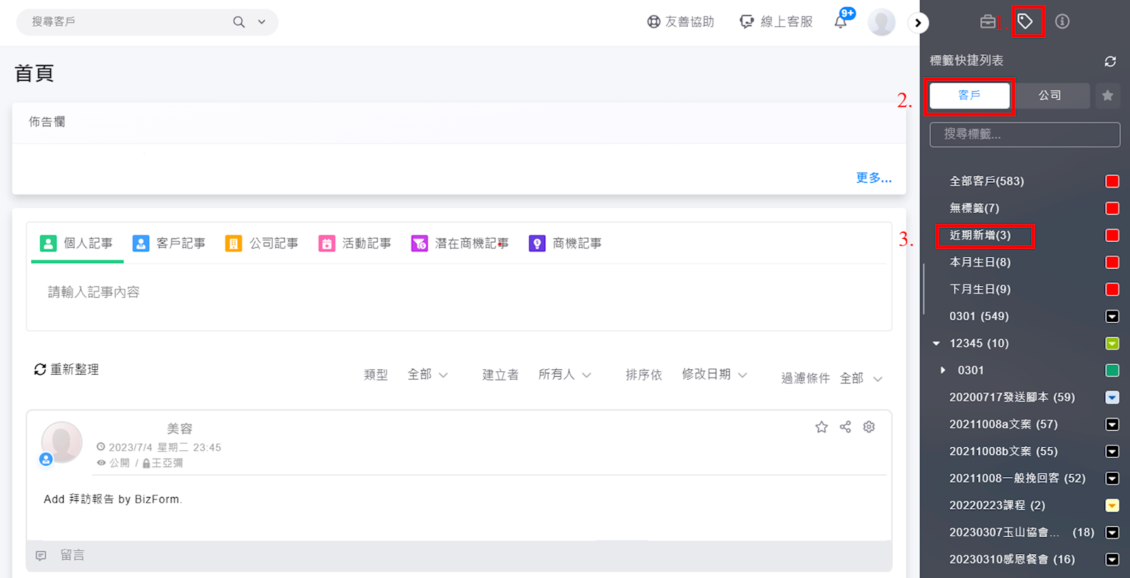 點選側邊欄的標籤>客戶>近期新增的標籤,這邊系統是預設30天內建立的新客戶資料