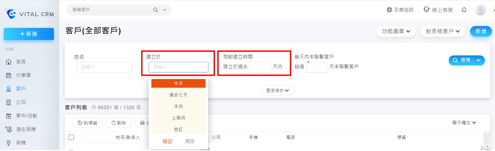 在客戶的頁面內,有一個建立於,點選"請輸入"的欄框,可以自訂時間區間或選擇既有條件進行篩選或是在相對建立時間輸入要查詢的天數進行篩選