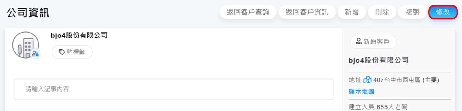 點選該公司名稱進入公司資料頁面,點選右上角的【修改】。