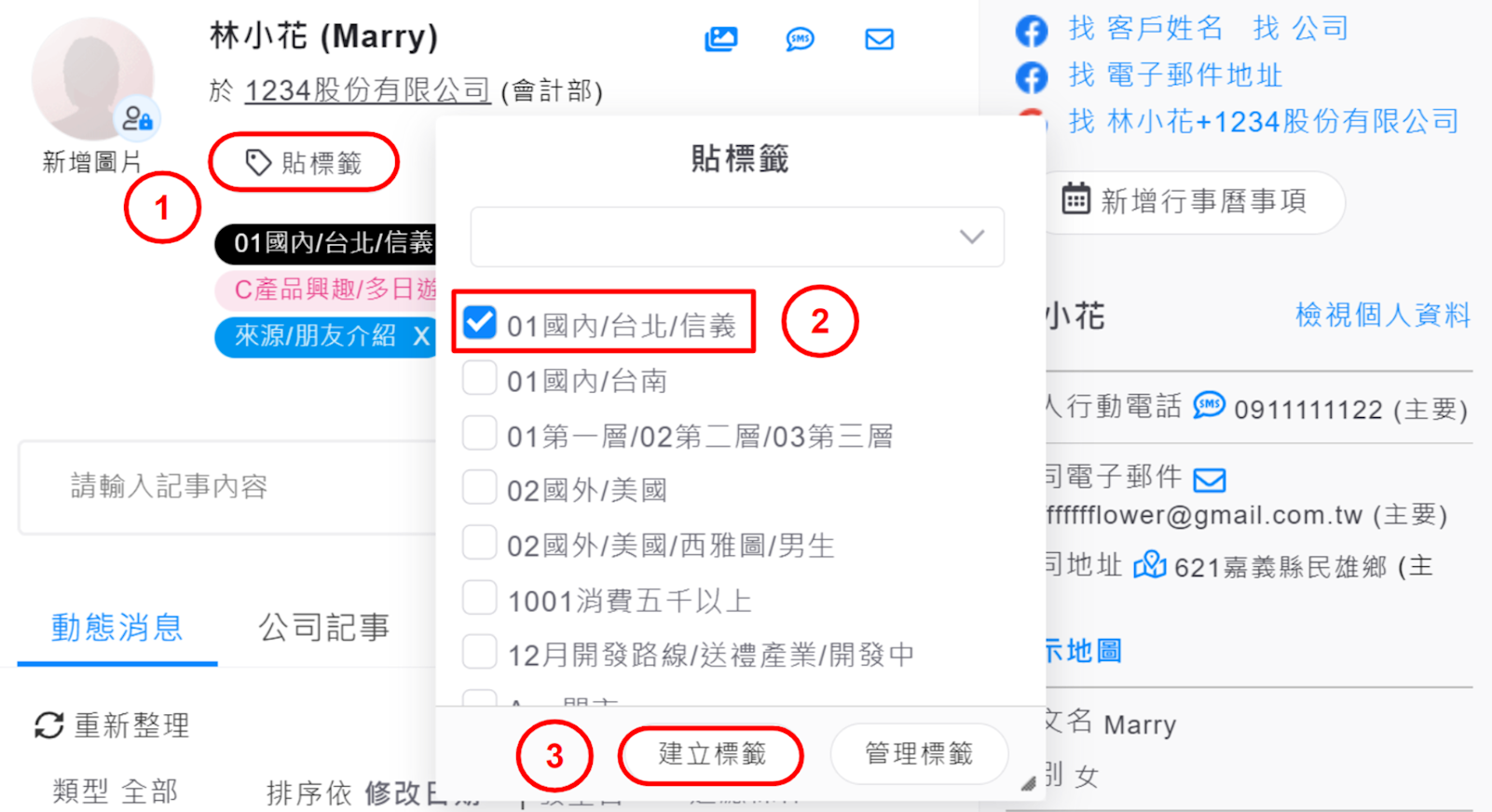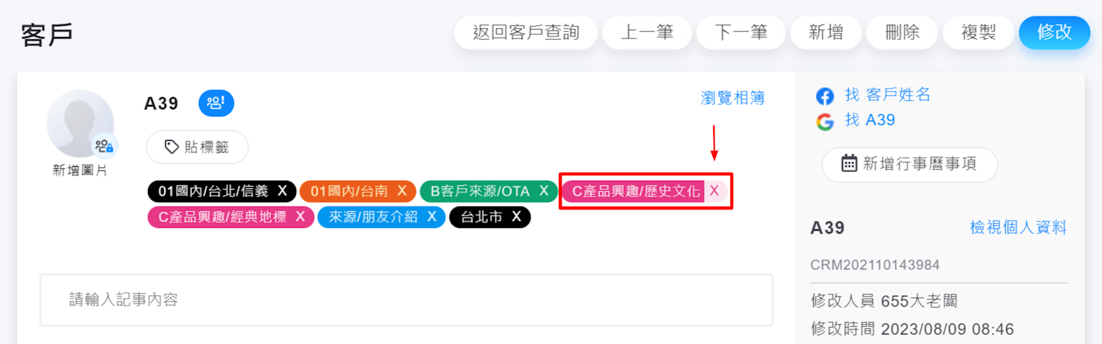 與客戶聯繫完之後,要修改成交機率的標籤,直接於客戶資料頁面中,點選【貼標籤】。