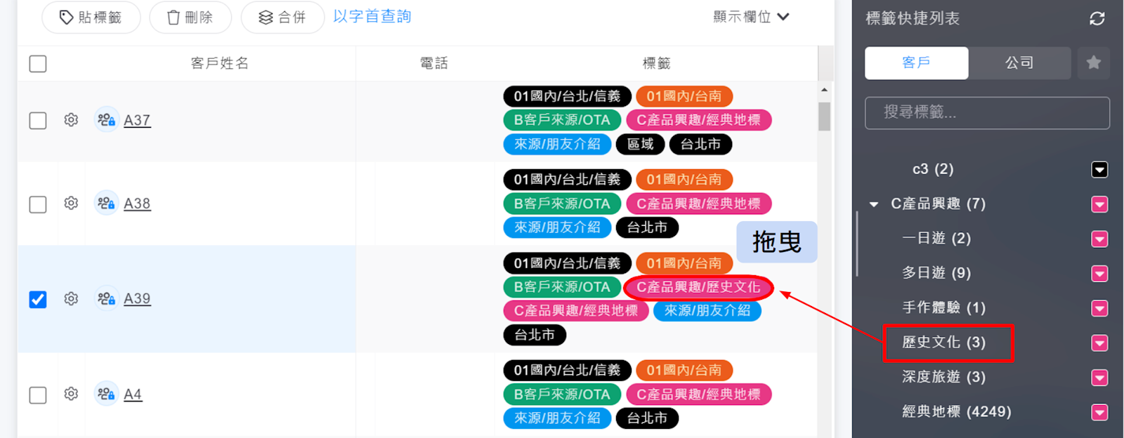 或者於客戶列表,直接從左方標籤列表中,選定標籤以拖曳的方式貼上客戶列表中欲貼上標籤的客戶,完成貼標籤動作。