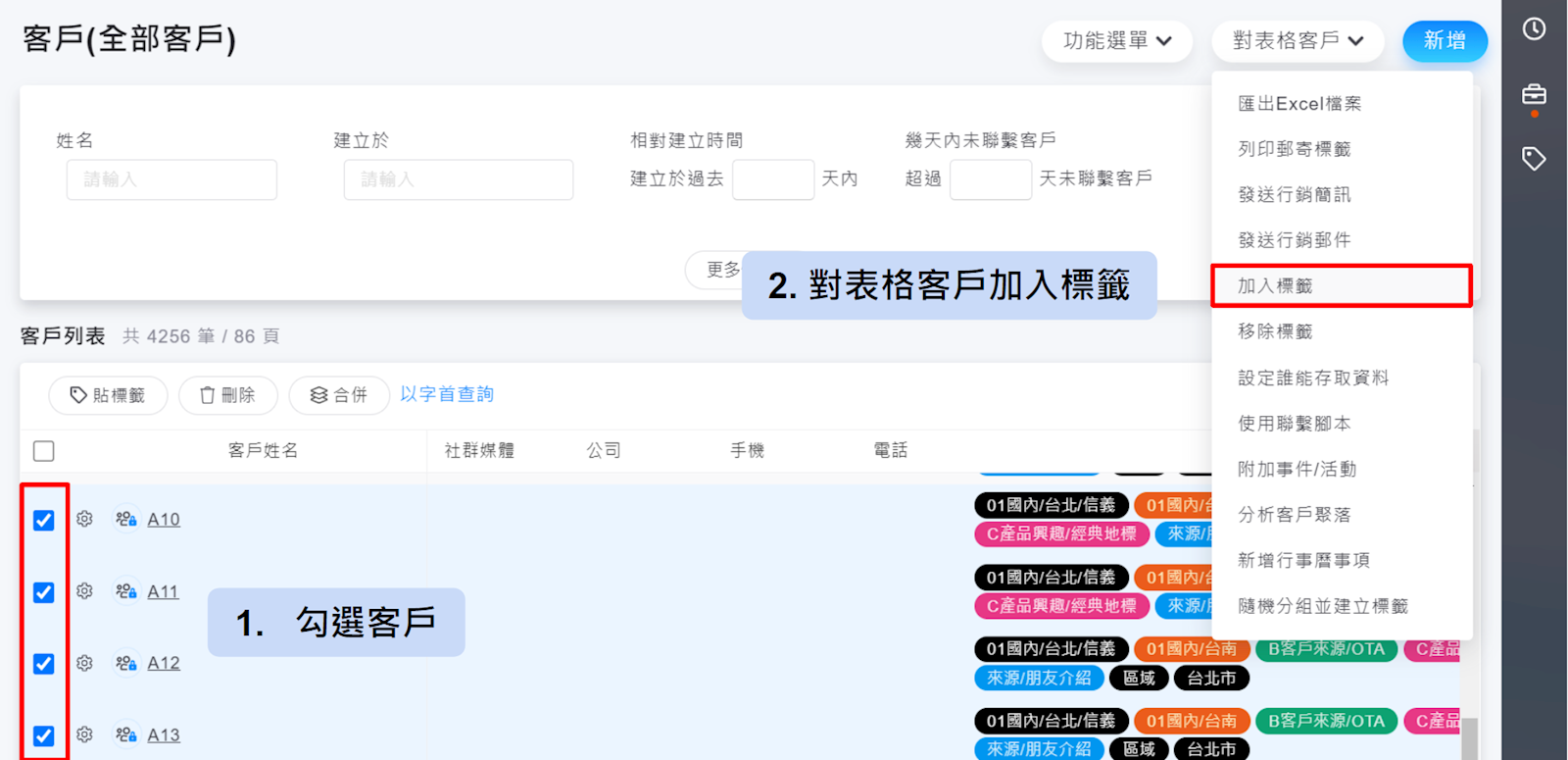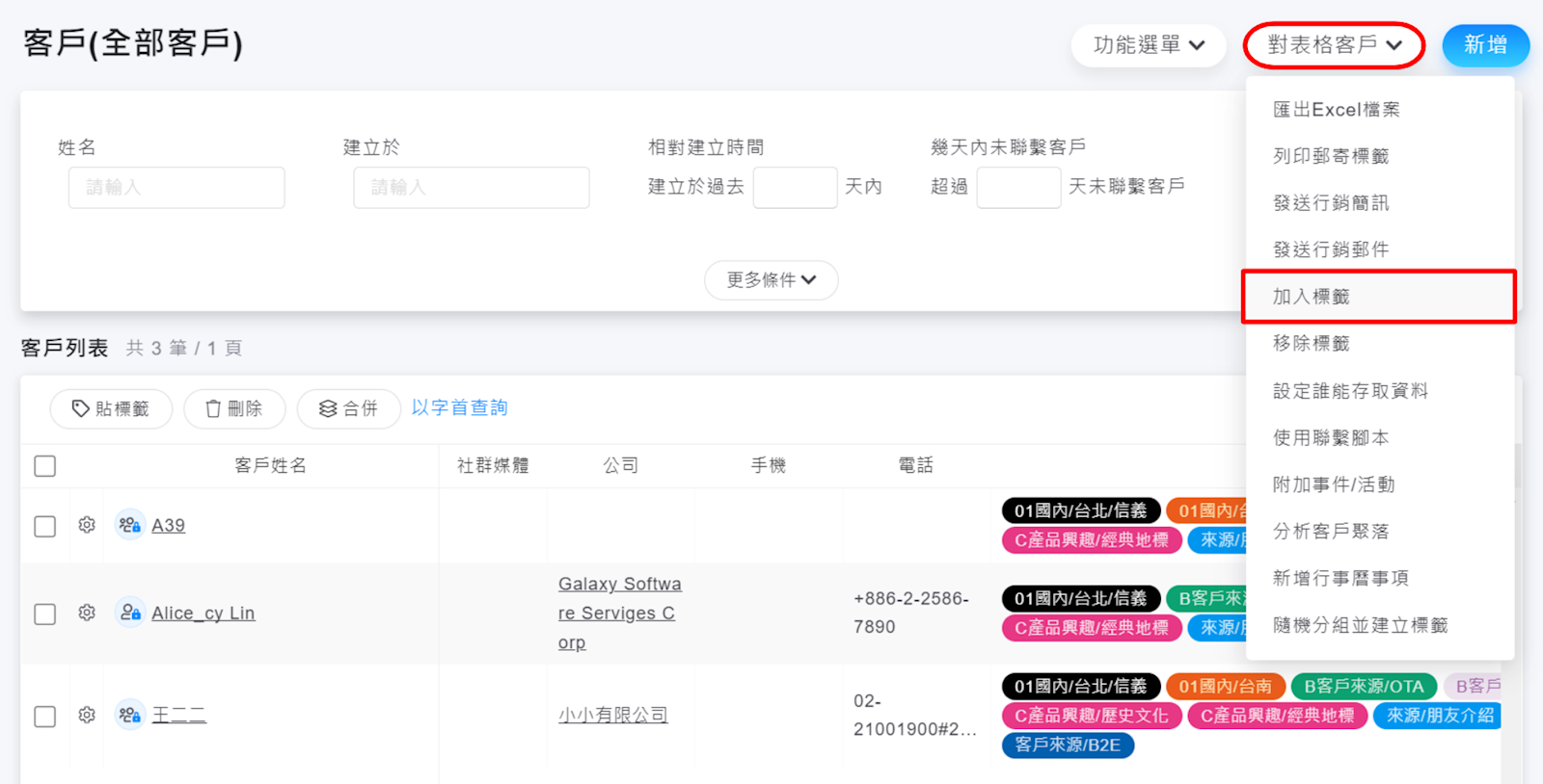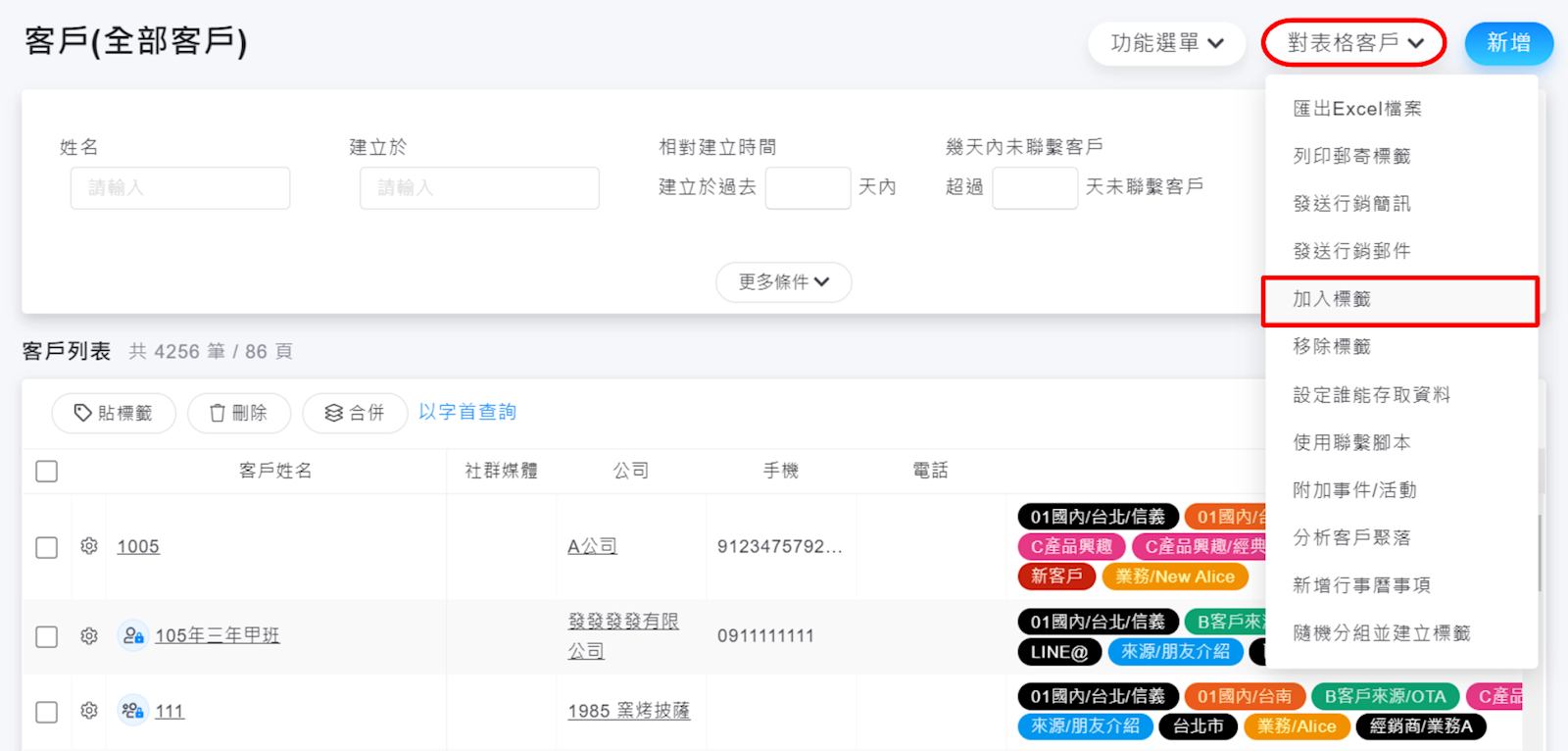 如果需要對表格內所有客戶貼標籤,不用勾選任何一筆客戶或逐頁勾選,直接【對表格客戶>加入標籤】,確認筆數是否正確之後,套用後系統就會自動將表格內的客戶貼上選定標籤。