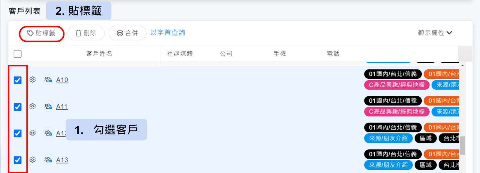 在客戶列表中,如果要針對特定客戶貼上相對應分類標籤,請在列表中勾選客戶名單,選用兩種方式可替選定客戶貼上標籤,如下: