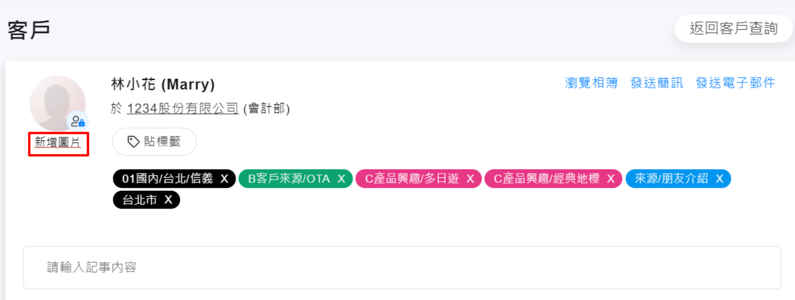 1. 首先,於客戶列表中選擇您欲貼上大頭貼的客戶,在客戶資料頁面中,客戶名稱旁的預設頭像下方,選擇【新增圖片】。