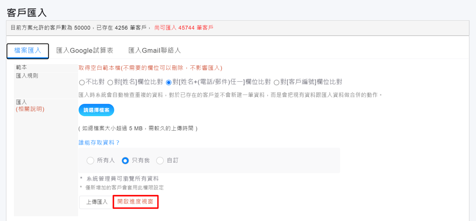 匯入客戶資料時,若不慎關閉瀏覽器(網頁)或關閉電腦時,系統仍然會繼續將資料匯入,可以重開進度視窗來檢視進度。若系統已經完成匯入,會通知您已經完成匯入工作。
