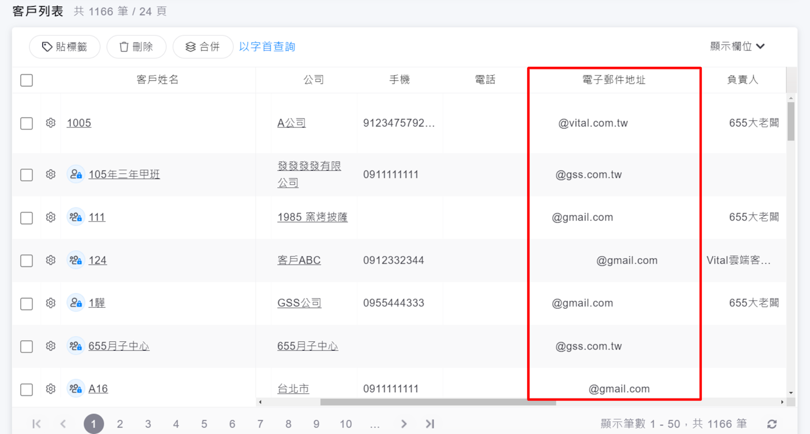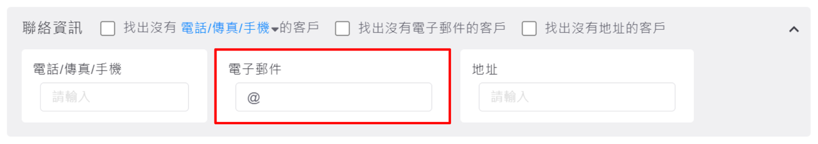 點選【聯絡資訊 >V >電子郵件】欄位輸入半形的「@」,輸入完畢,點選右上方【搜尋】即可。