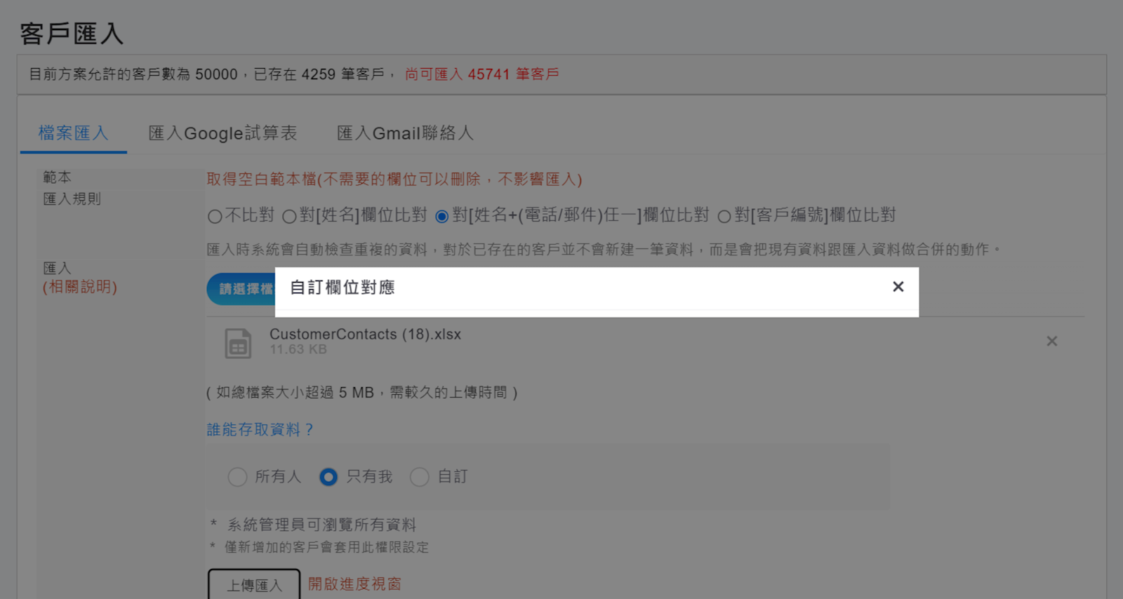| 如果您在上傳客戶資料時,沒有顯示【自訂欄位對應】視窗如下圖所示: |