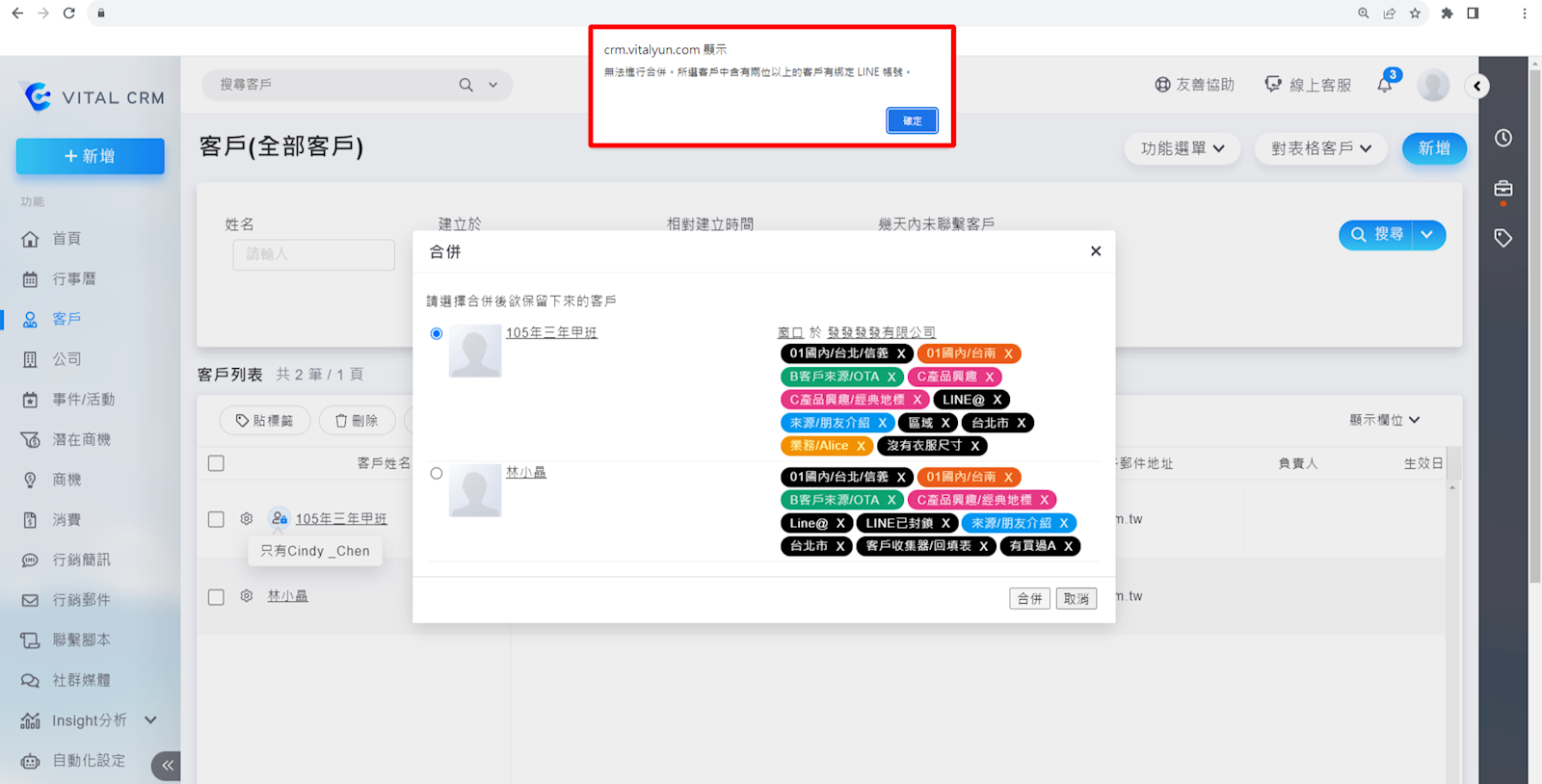 若欲合併的客戶含有兩個以上身上有綁定 LINE@ 好友,則無法進行合併。