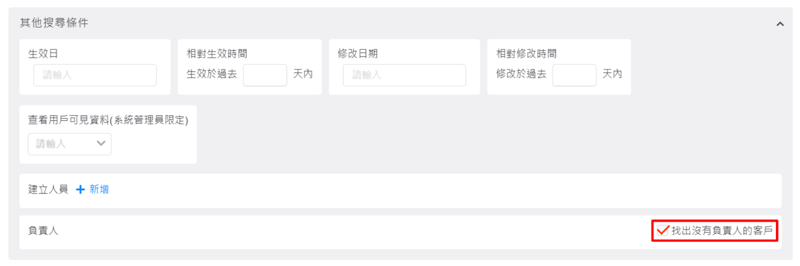 於列表左上方,點選【更多條件>其他搜尋條件>找出沒有設定負責人的客戶】,即可篩選出尚未指定負責人的客戶。