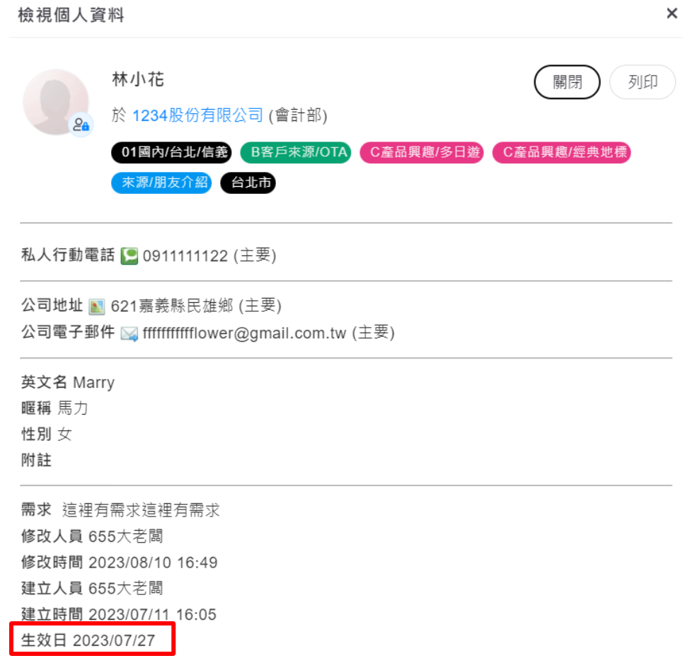 客戶、公司基本資料中的「生效日」欄位,是用來記錄該客戶/公司在外部系統的建立日期。