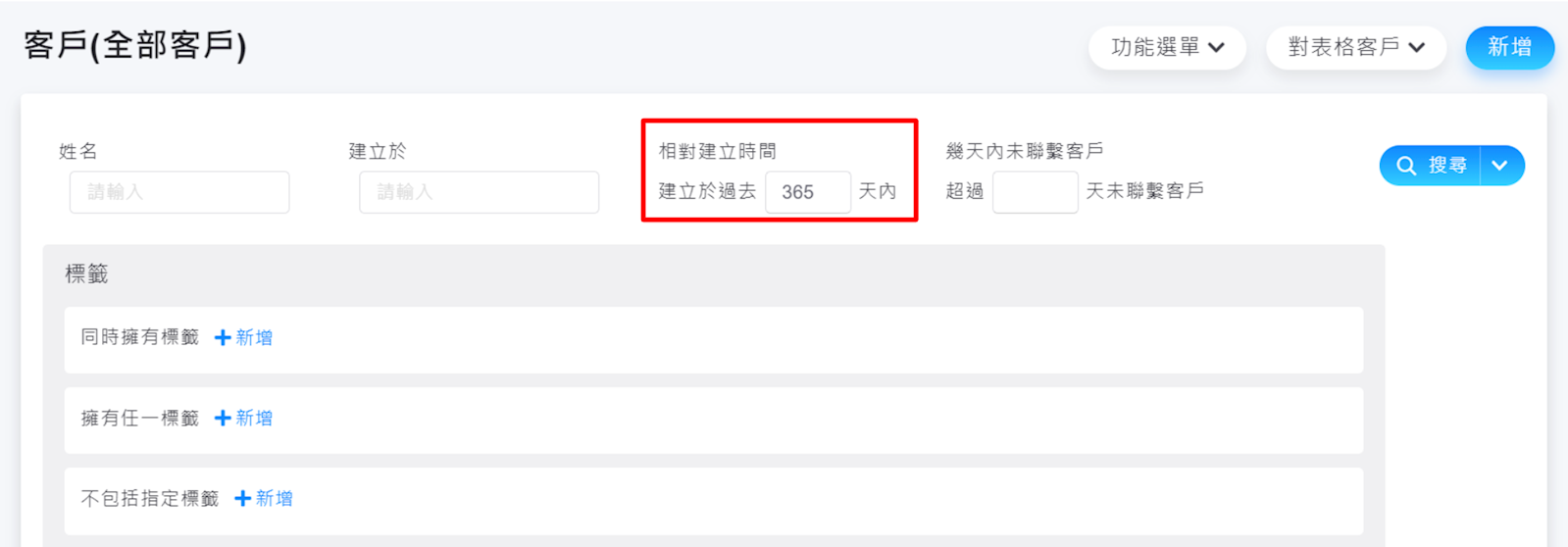 如下圖舉例,可查詢【建立於過去365天內】,並且【修改於過去30天內】的客戶,兩者可以個別使用,亦可以同時作為查詢條件。