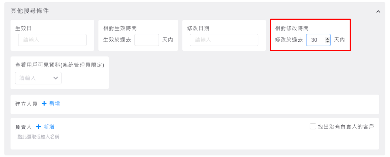 請在客戶功能中展開【更多條件】,即可在【相對建立時間】或【相對修改時間】欄位中輸入條件,找出於特定天數內建立(或修改過)的客戶。