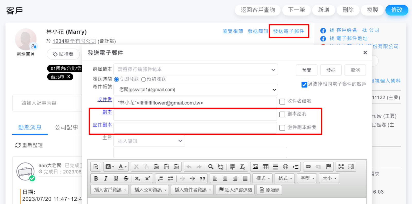 請點擊客戶個人資料頁右方的【發送電子郵件】,系統會跳出郵件編輯視窗,可在此看見【副本】及【密件副本】的欄位。
