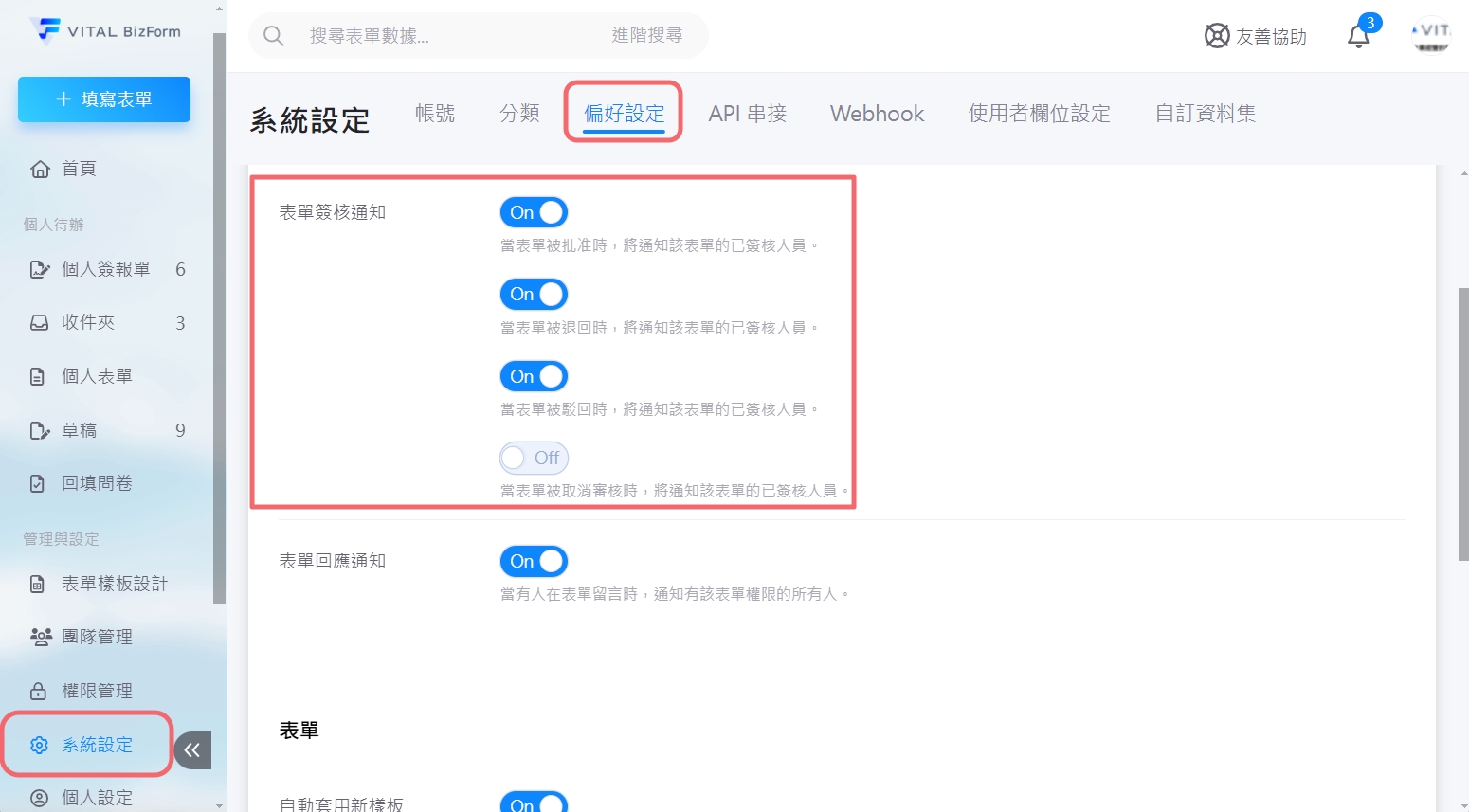 除了表單的申請人會收到通知,若系統管理員有在【偏好設定】開啟表單簽核通知,系統將自動通知所有已審核人員,無論表單是被批准、退回、駁回還是取消審核。