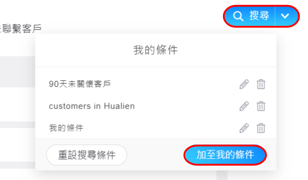 2. 確認搜尋出來的客戶名單無誤,請點選【搜尋】按鈕旁邊的【V】,再點擊【加至我的條件】。