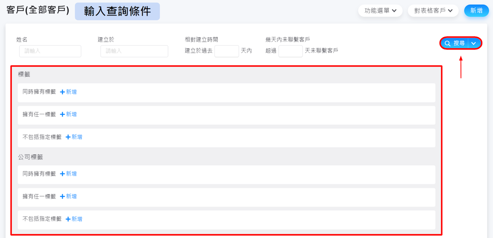 1. 從上方功能列表中進入【客戶】,進入客戶功能頁後,輸入查詢條件,點選【搜尋】。