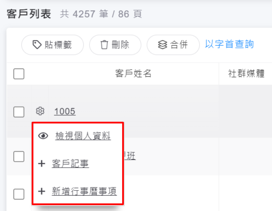 請將游標移至客戶列表上姓名前方「快速功能選單」的齒輪按鈕,可在此選擇新增客戶記事及行事曆事項,新增時,畫面不會因爲操作功能而跳轉或重整。