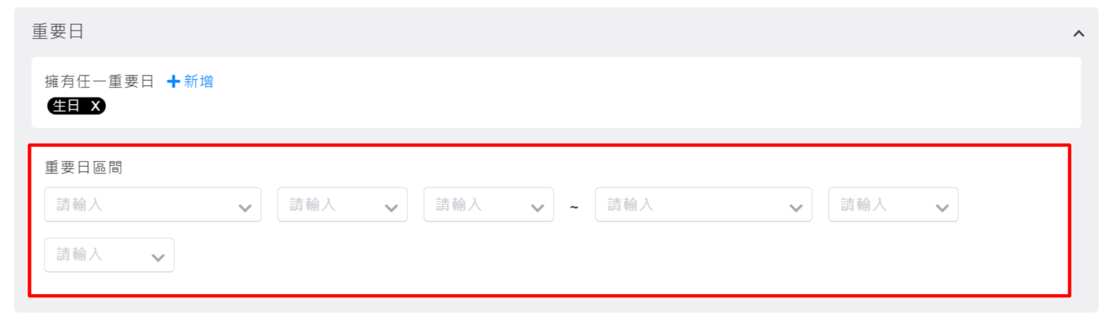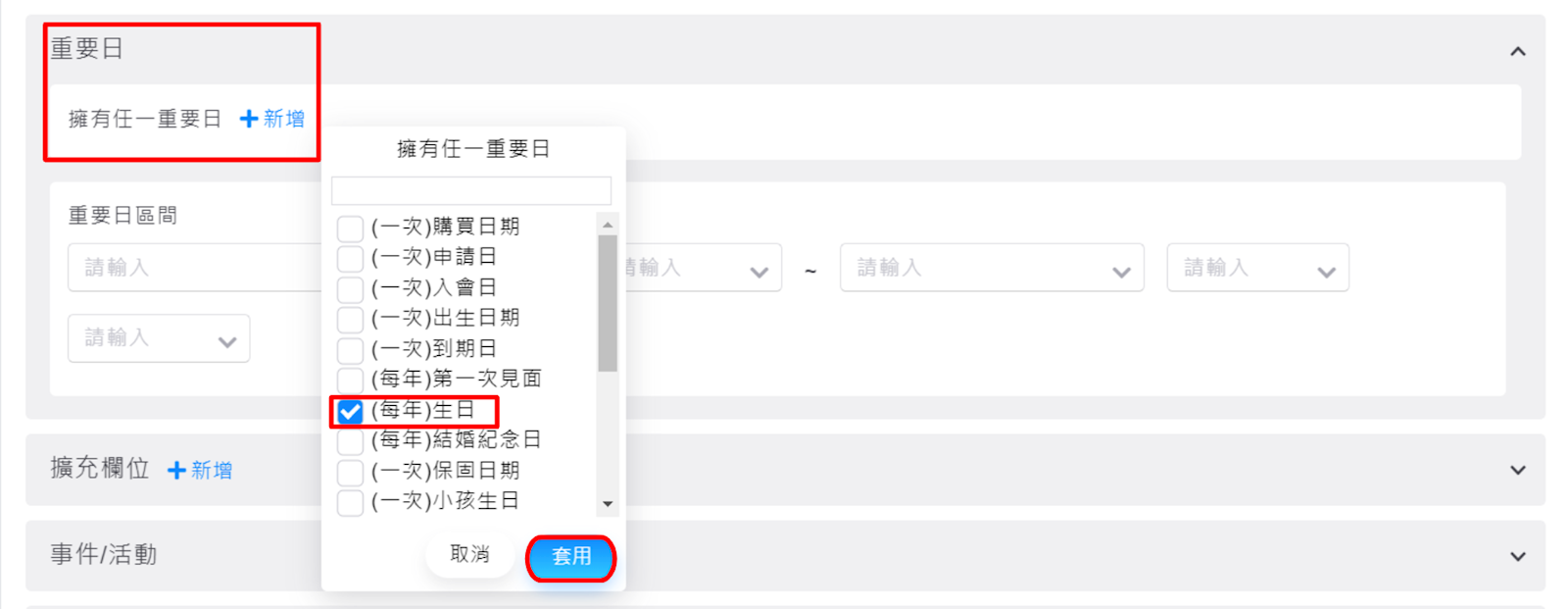 1. 請在【客戶>更多條件>重要日>新增】,並選擇【生日】選項。