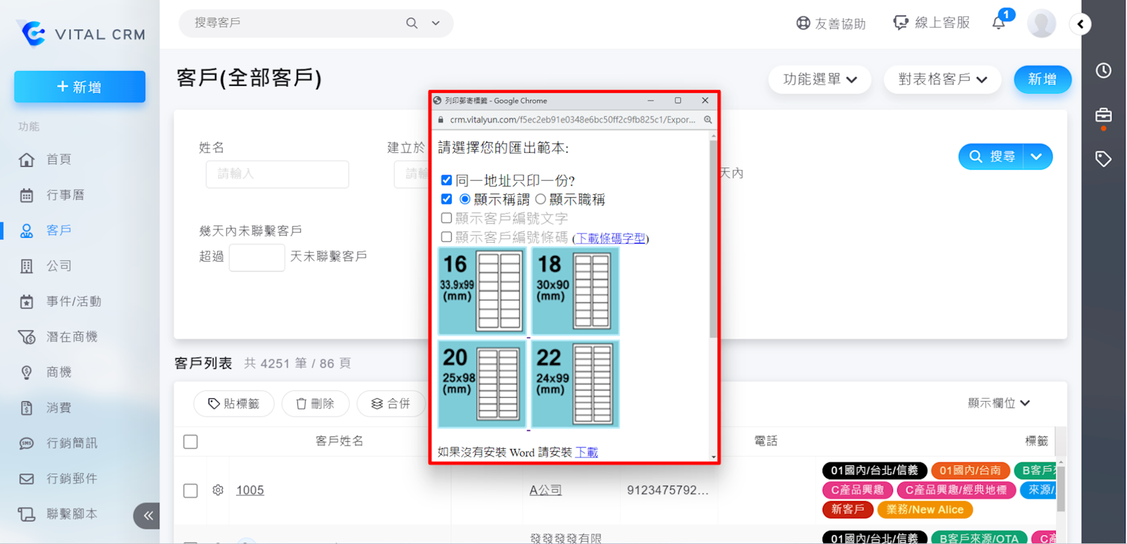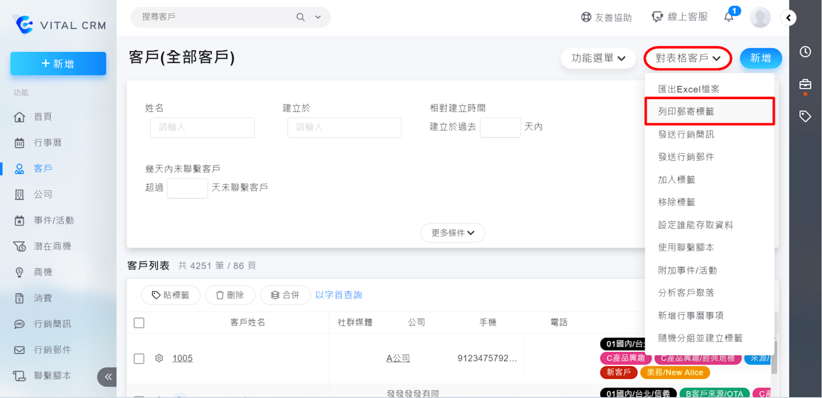 1. 您可以點選【對表格客戶>列印郵寄標籤】,含有郵遞區號、地址、公司名稱、客戶姓名等資料可供使用。