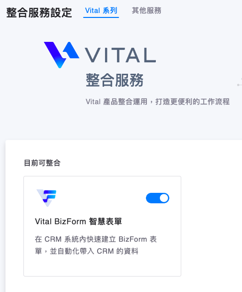 2. 回到CRM中開啟整合服務:請至左方列表「整合服務」進入,將「Vital BizForm 智慧表單」開啟