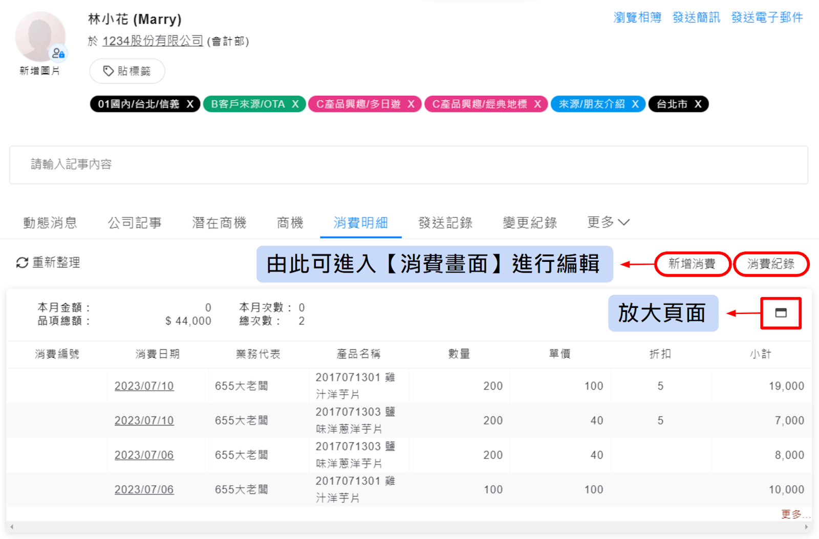 ※從客戶中查詢消費資料,點擊頁面中的【新增消費】與【消費紀錄】會進入消費頁面,在這裡才可以進行消費資料的編輯動作。