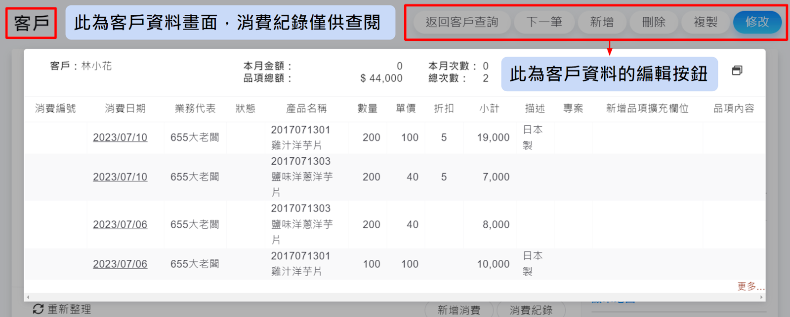 客戶資料中的消費紀錄僅供查閱,不能做修改及刪除的動作,尤其是在【放大頁面】的查閱情況下,此畫面中的編輯按鈕為「客戶資料」所用,並非「消費資料」的按鈕,所以在此【刪除】的資料為客戶資料。