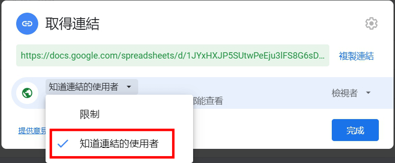 ※ 取得共用連結時,請務必將檢視者設為「知道連結的使用者」。