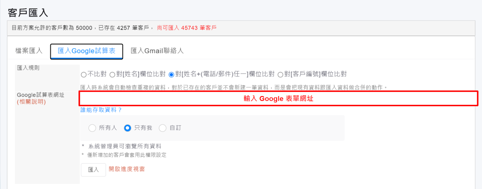 2. 匯入 Google 試算表是採共用連結的方式,因此不需要通過 Google 驗證即可使用。將Google表單網址貼入,設定匯入規則,點選【匯入】後,系統就會開始匯入您的客戶資料。
