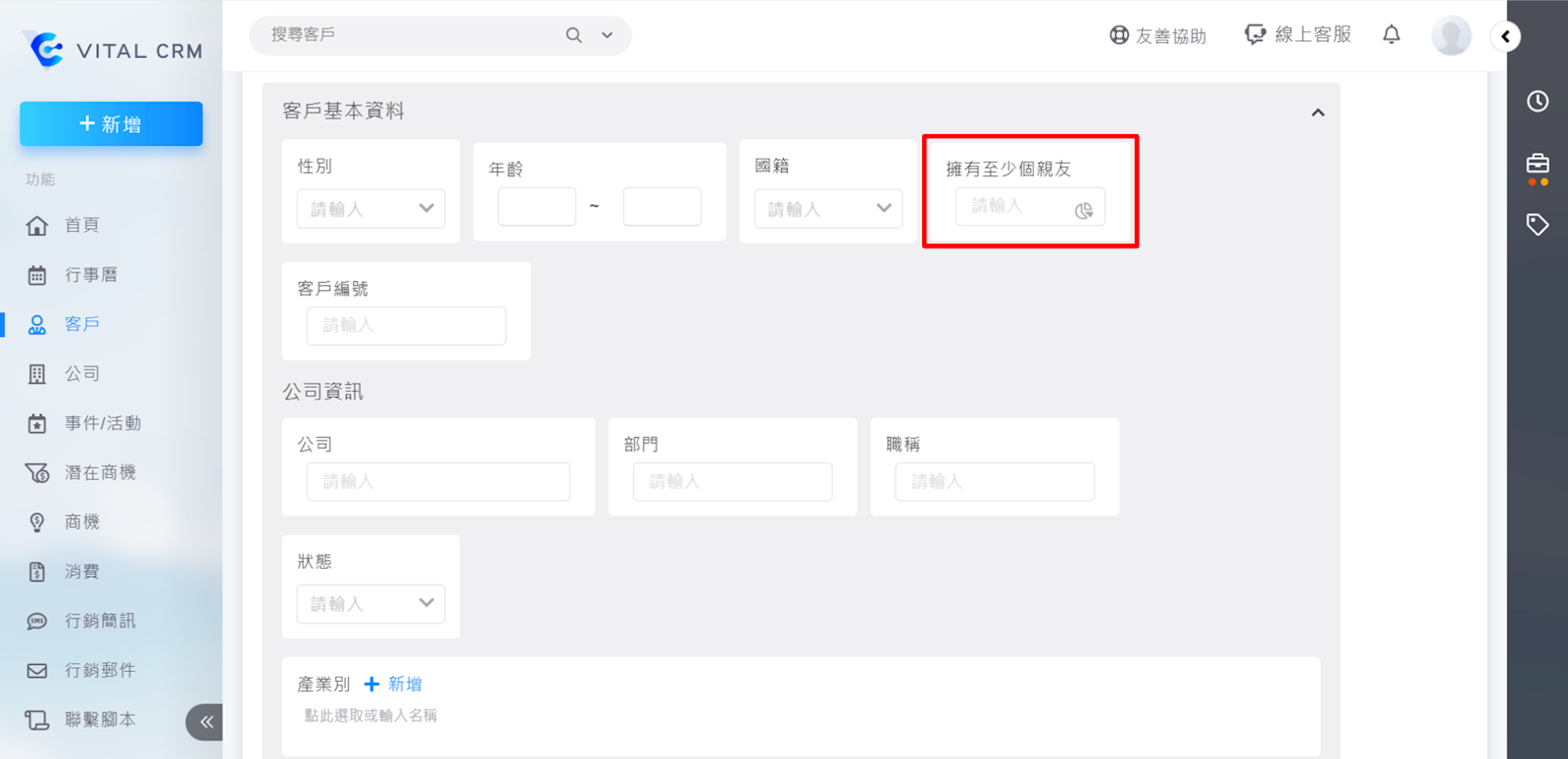 於首頁左上方點選【客戶>更多條件>客戶基本資料】可以篩選有親友的客戶。