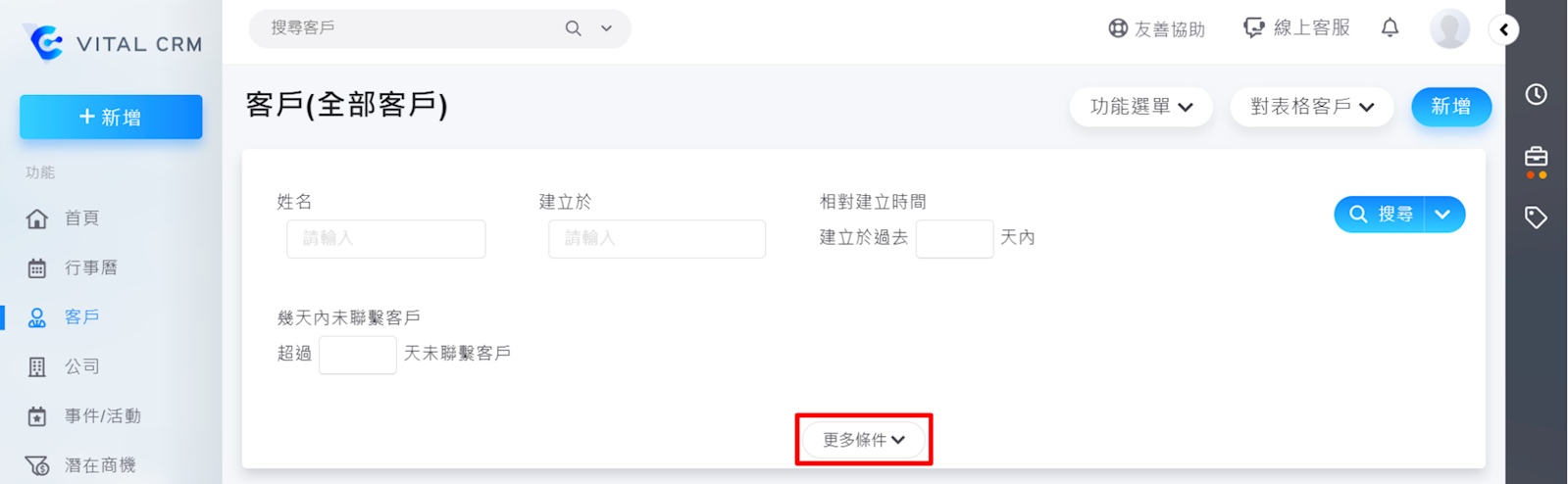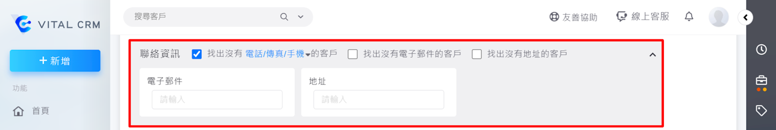 於首頁左上方點選【客戶>更多條件>聯絡資訊】,在地址欄輸入地址即可透過地址搜尋客戶。