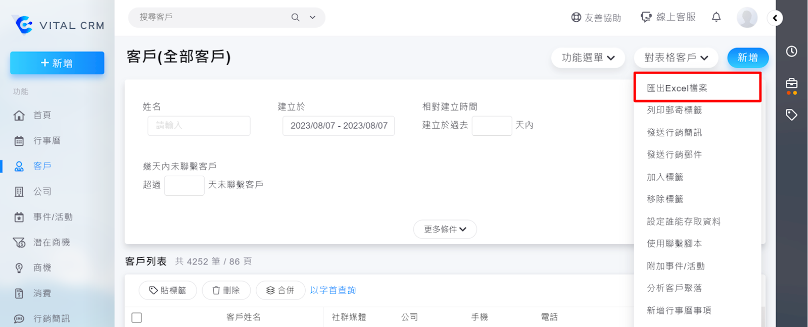 3. 匯出客戶:請在右上角【對表格客戶】中選擇【匯出Excel檔案】。