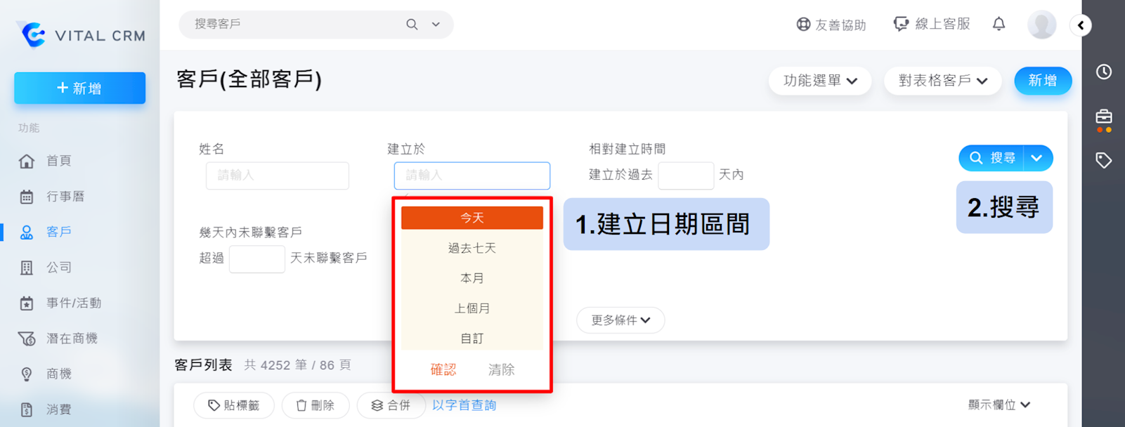 如何透過「建立日期」區間匯出客戶資料?