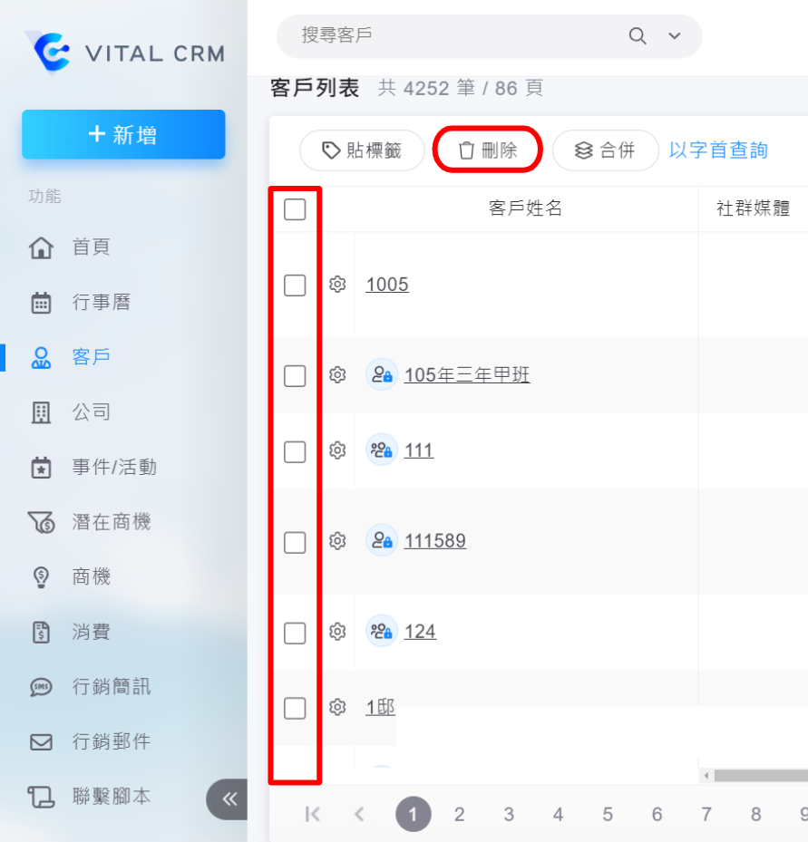 4. 刪除客戶:勾選客戶後點擊上方的【刪除】按鈕,如要刪除整頁客戶,請勾選最上方的框框後,按下【刪除】鈕。