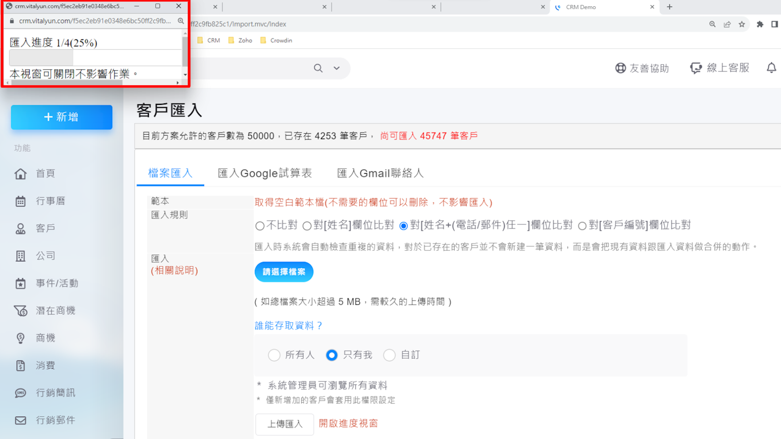 | ※匯入客戶後,系統會出現匯入進度百分比視窗,此視窗匯入完畢後不會自動關閉,需手動點選關閉按鈕,再進行匯入。 |