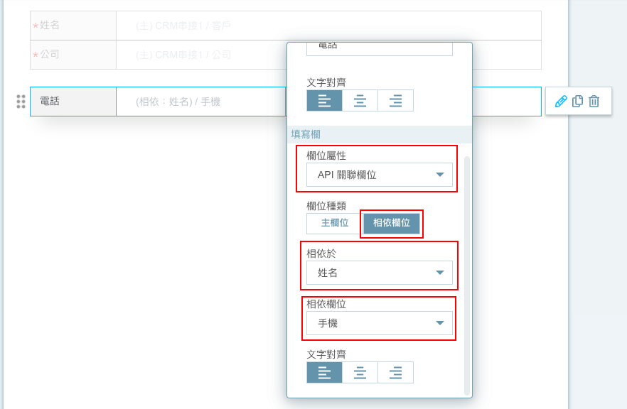 2. 相依欄位:意指客戶、公司或商機資料中的其他相關欄位,例如「電話、地址、電子郵件、客戶編號、公司編號」等等 CRM 系統中預設的資料欄位,根據相依的主欄位(客戶、公司或商機),系統會抓取相關資料。