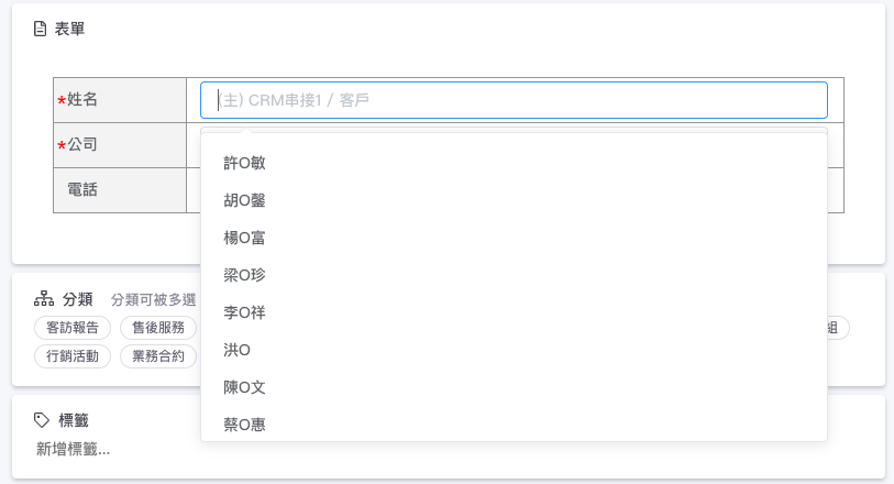 輸入關鍵字時,系統會抓取 CRM 系統中既有的資料內容。
