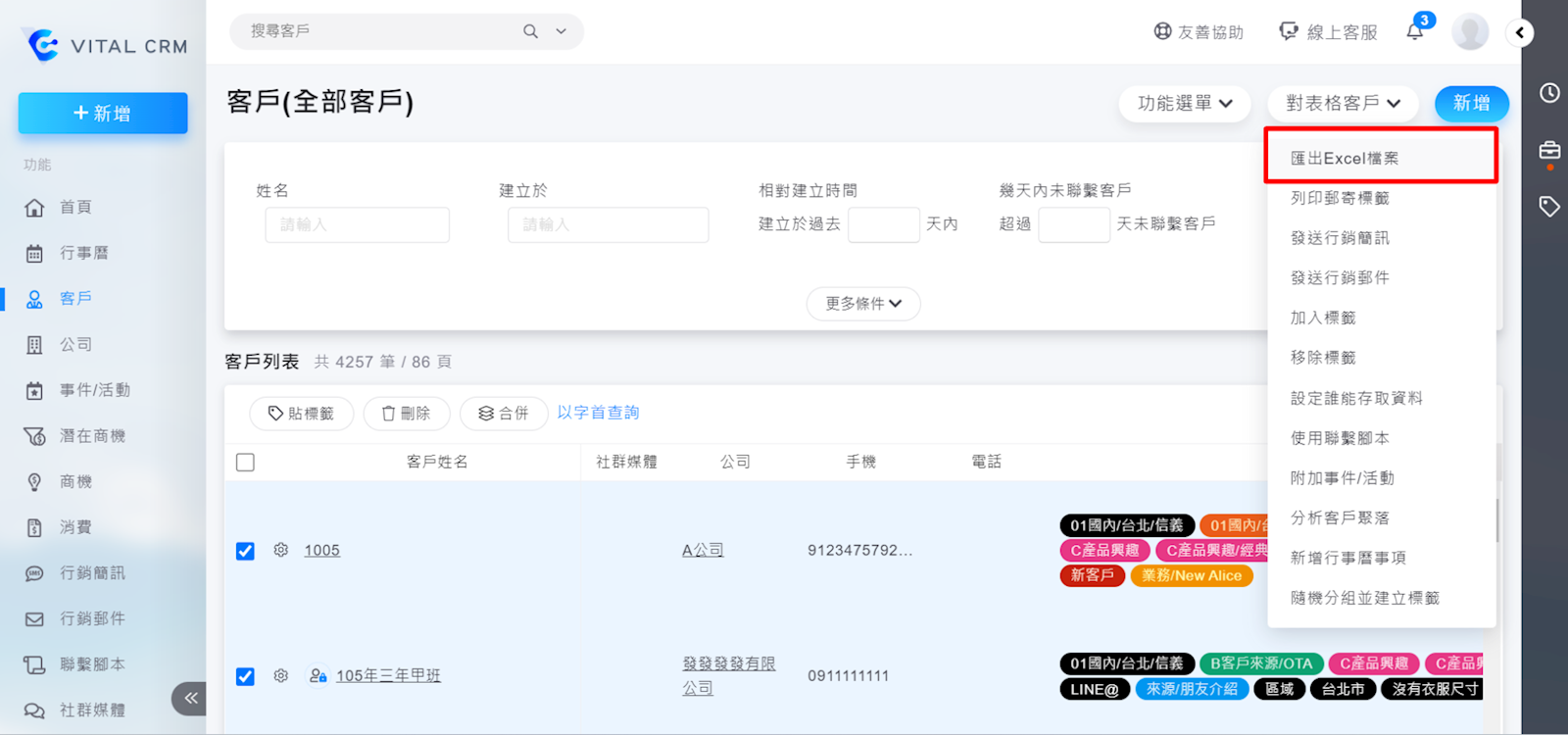 2. 確認您查詢的客戶名單無誤後,右上角【對表格客戶>匯出Excel檔案】即可。
