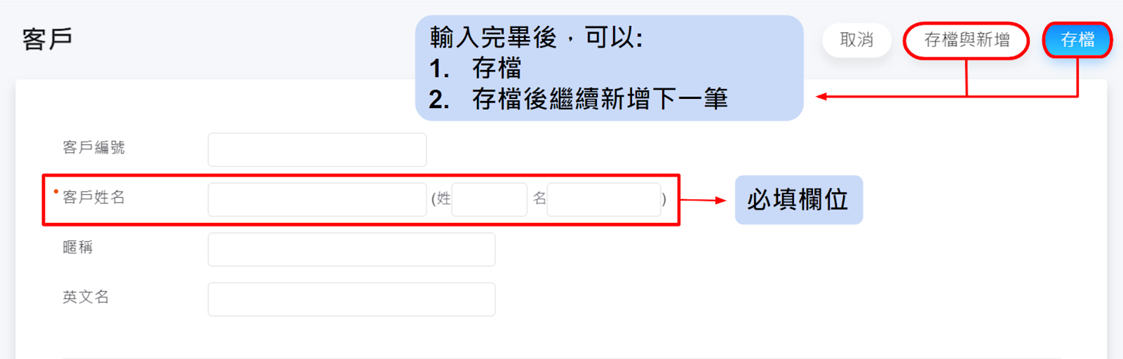 系統都有預設基本客戶資料欄位,依欄位名稱輸入資料,輸入完畢後點選右上角【存檔】,或者【存檔與新增】存檔後繼續新增下一筆客戶資料。