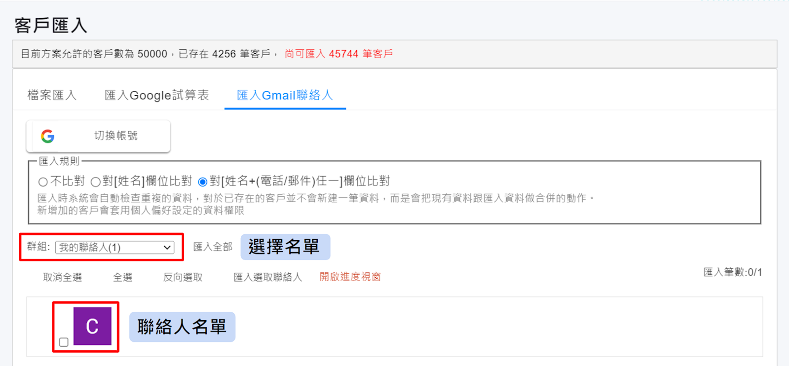 設定匯入規則,選擇匯入聯絡人名單,點選【匯入選取聯絡人】後系統就會開始匯入您的客戶資料。