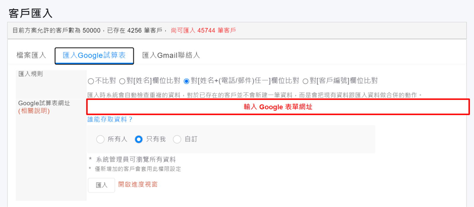 (2) 匯入Google試算表:將Google表單網址貼入,設定匯入規則,點選【匯入】後系統就會開始匯入您的客戶資料。