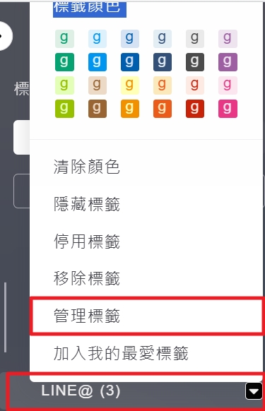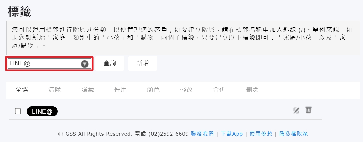 於標籤快捷列表使用「管理標籤」至標籤列表畫面,會自動將使用者所點擊的標籤帶入關鍵字並過濾。以下圖為例,如在標籤快捷列表中,選擇以「LINE@」標籤使用「管理標籤」進入編輯頁面,系統則會自動帶入「LINE@」作為關鍵字搜尋。